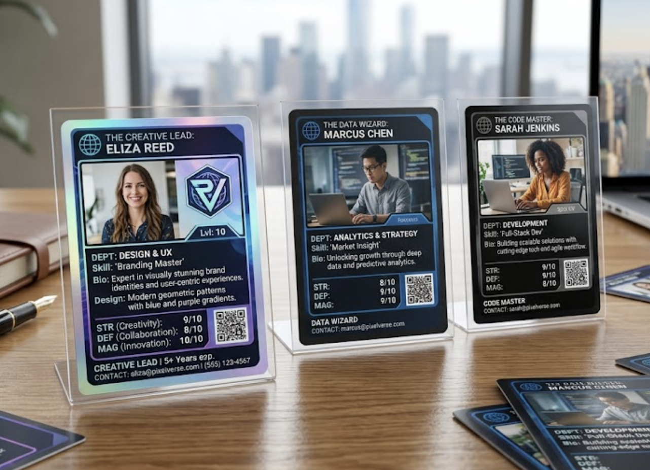 Custom trading cards are premium-printed cards (typically 2.5″ x 3.5″) featuring your brand, team members, products, or brand story elements designed specifically for marketing and promotional use. Unlike business cards or brochures, custom trading cards are designed to be collected, traded, and kept as memorable brand artifacts.