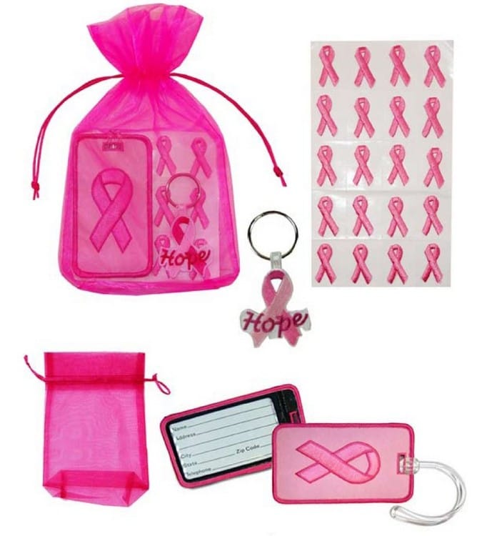 This Pink ribbon kit contains (20) 1 1/8″ embroidered peel and stick Pink ribbon appliques on a perforated sheet for easy removal, an embroidered Pink ribbon luggage tag, and an embroidered HOPE Pink ribbon key ring. Items come packaged in a 5 1/2″ x 10 1/2″ Pink Organza drawstring bag.