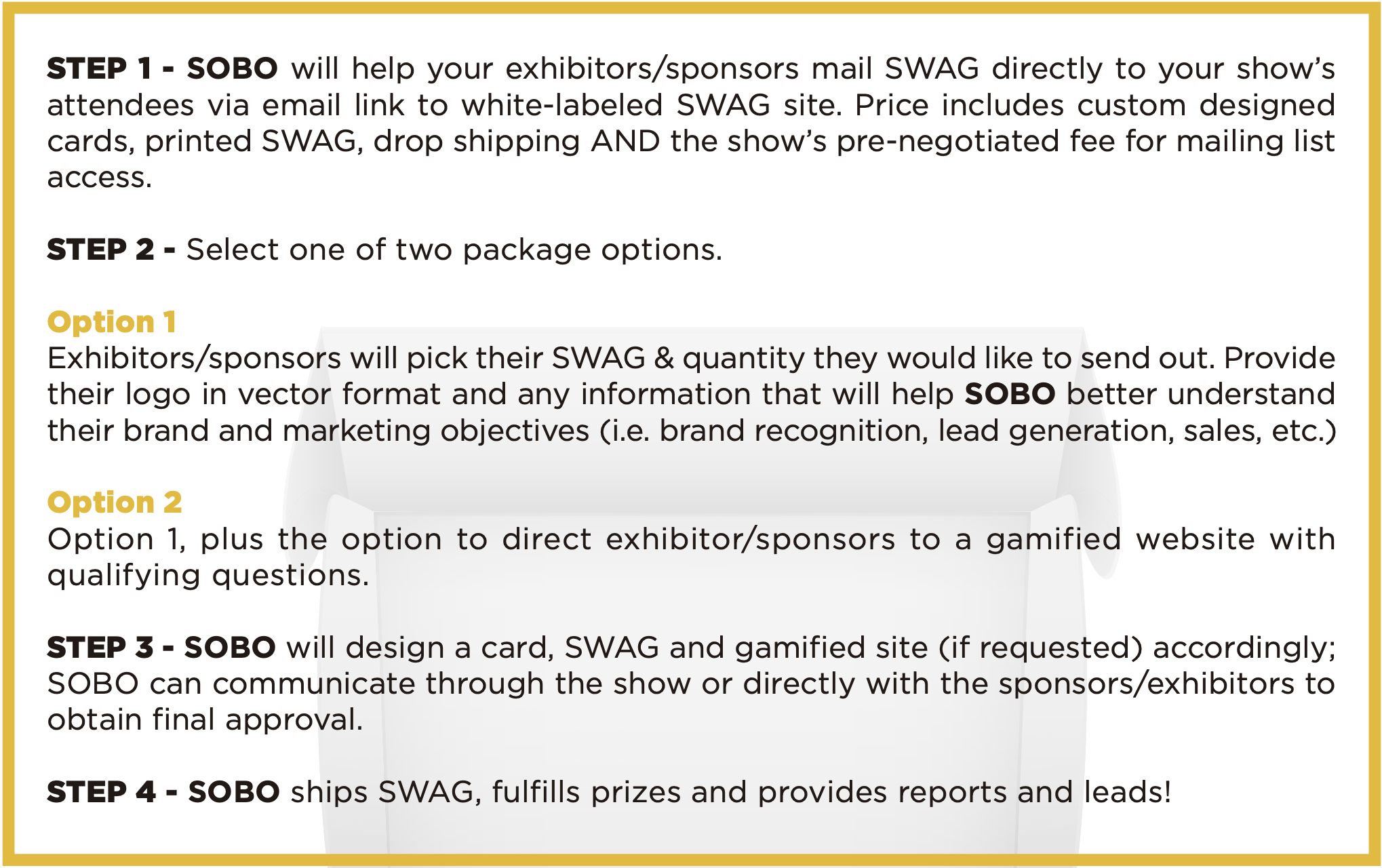 Most giveaways are designed as one-size-fits-all despite the diverse crowd of attendees at the show, but SOBO’s Solution can be tailored towards the specific recipient, or even segmented out and sent to your targeted list based off of industry, age, demographics, past year’s sales, etc.